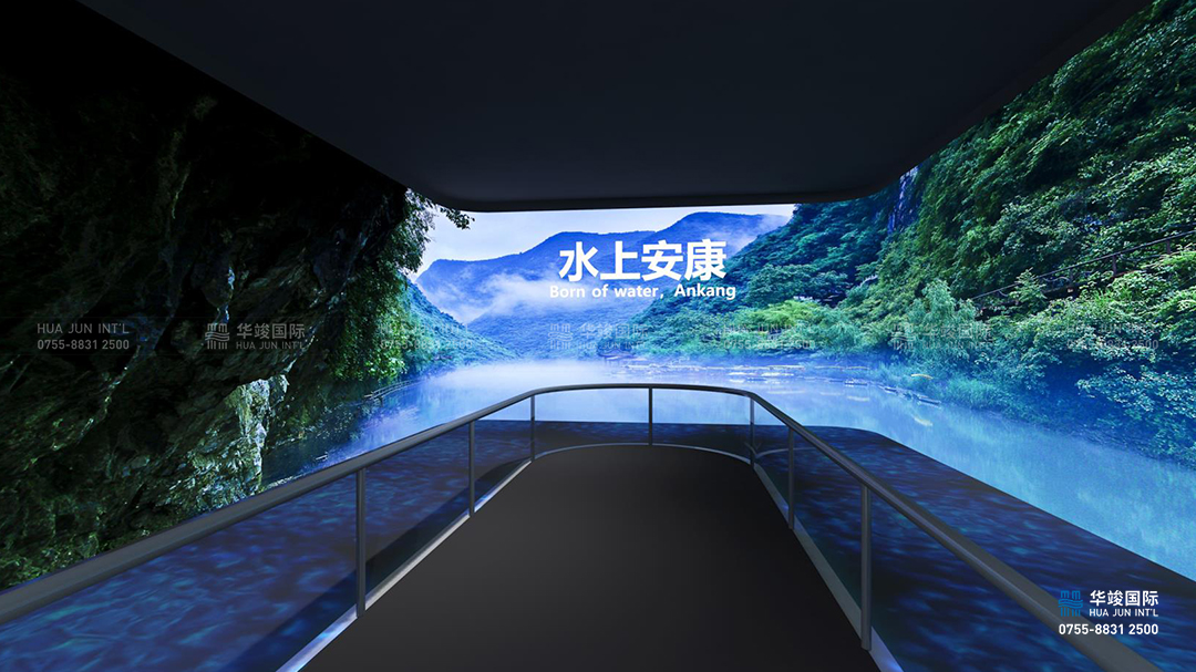 江水浩蕩,水上安康。通過沉浸式體驗空間讓參觀者來一場飛越之旅,從空中俯瞰安康水,從安康水上呼嘯而過,在安康水下暢游,營造身臨其境的感覺,從時間和空間的維度上,讓參觀者感受到安康水脈縱橫,水資源豐富,水質(zhì)優(yōu)良。