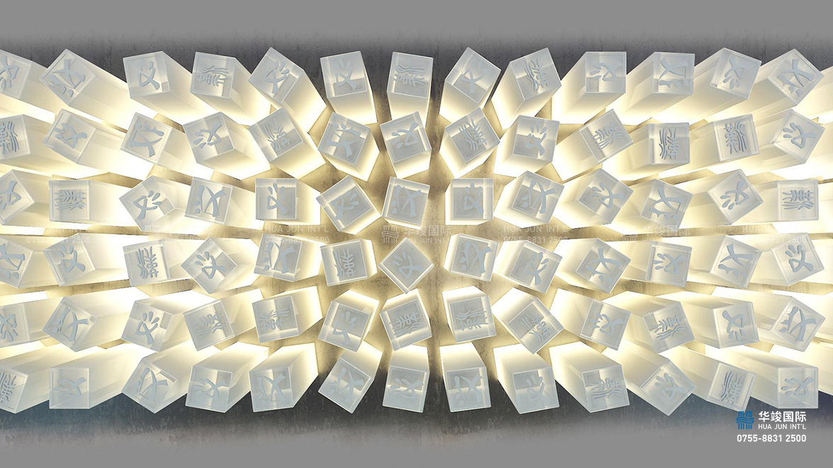 漢中是國內唯一一個以”漢”字為開頭的城市,也是漢人老家、漢文化的發源地之一,在中國歷史上有著不可忽視的地位,在漢文化中有著極為重要 的歷史價值?!睗h“字對于中國、對于漢文化、對于漢中都有著極其特殊的意義,因此,在這里將”漢“字提煉為吊頂元素,以一百八十種不同寫法的“漢”字制作為仿印章的造型燈,排布于天花之上,猶如海浪起伏變換,使參觀者感受”漢人老家“的磅礴氣韻。