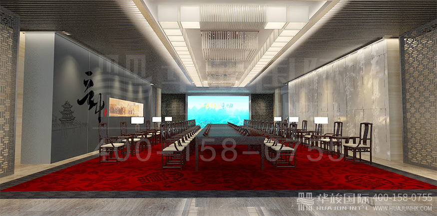 序廳頂部,采用LED矩陣燈組合成文字,以科技新穎的方式呈現(xiàn)公司主題理念。背景墻下以高低錯落的LED屏,滾動播放集團文化。整個序廳虛實結合,古今交融,四圍采用傳統(tǒng)中式風格,天地融合現(xiàn)代科技手段,整體格局相輔相成,渾然一體。
