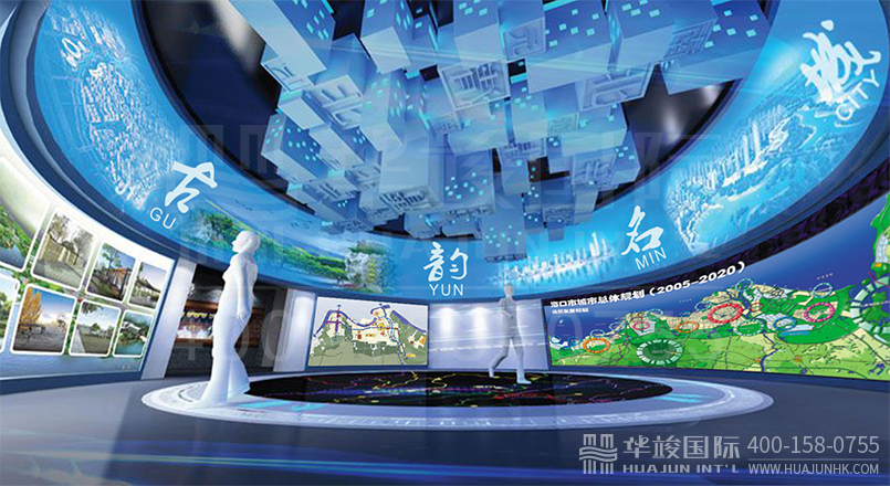 從空中、地上、地下打造三位一體的??诖蟾窬帧R?60度弧幕投影圍繞海南文化篆刻字造型,配合地面數字沙盤,全方位一體化展示??诘娜f象更新。